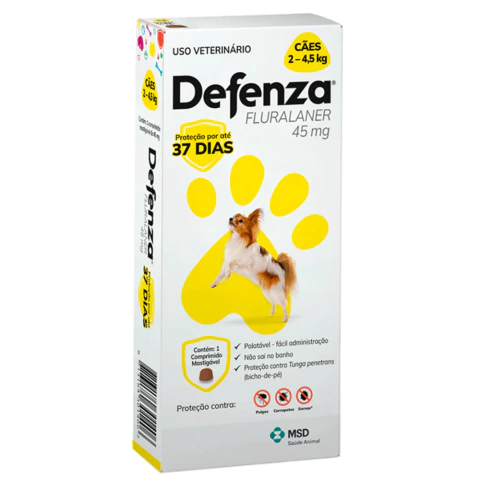 Defenza 45mg para Cães (2 a 4,5kg) é a solução eficaz que seu melhor amigo precisa para combater infestações de pulgas, carrapatos e ácaros. Este ectoparasiticida sistêmico proporciona até 37 dias de proteção contra pulgas e carrapatos, além de 30 dias contra sarnas.